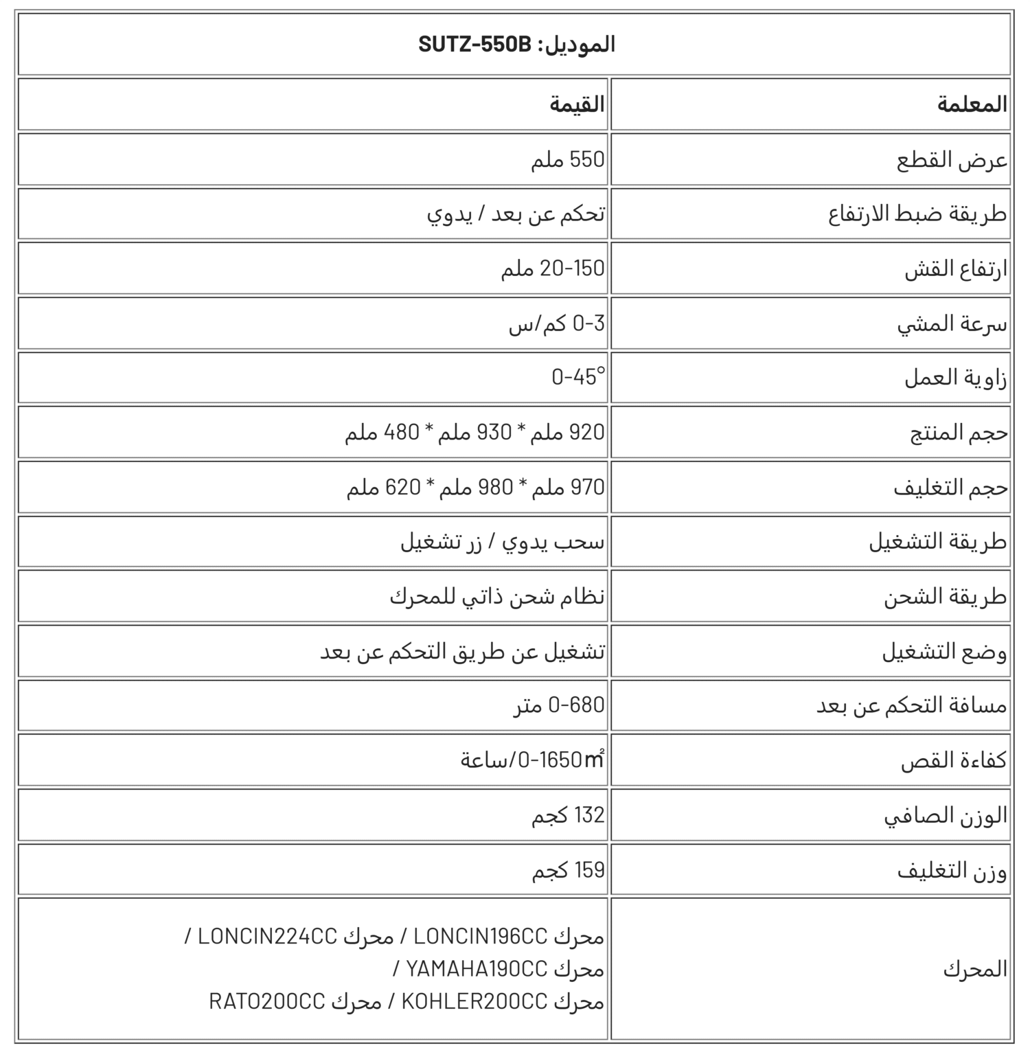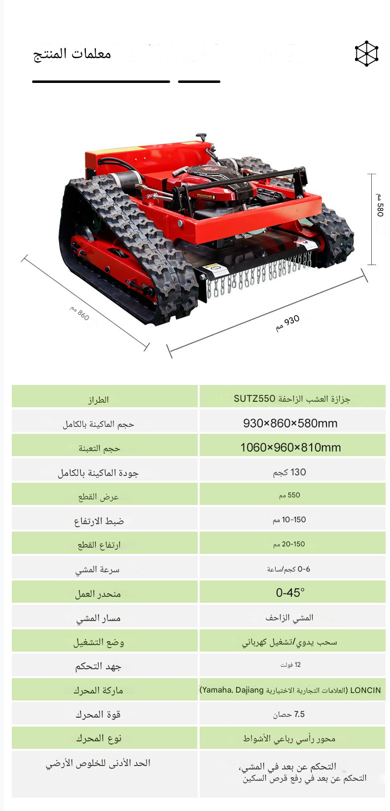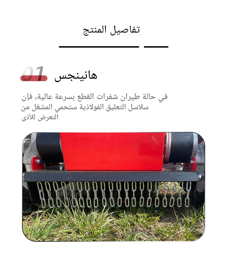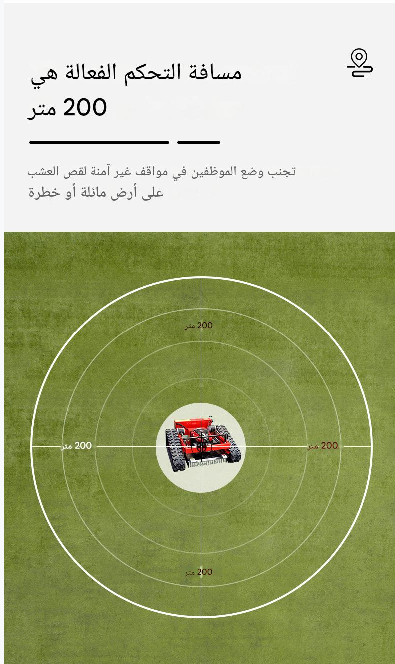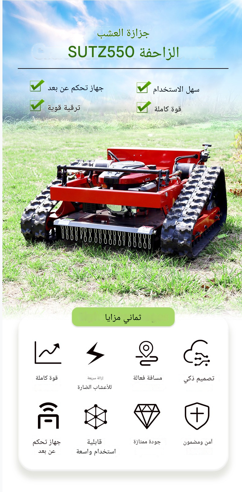 جزازة العشب الزاحفة SUTZ-550B التي يتم التحكم فيها عن بُعد هي جزازة عالية الأداء تعمل عن بُعد ومصممة للمنحدرات الشديدة والمروج الكبيرة والمناظر الطبيعية التجارية. مع عرض قطع 550 مم وارتفاع قابل للتعديل للقص (20-150 مم)، توفر قطعًا دقيقًا بسرعات تصل إلى 3 كم / ساعة، وتغطي 1650 مترًا مربعًا / ساعة. تعمل بخيارات محرك متعددة (Loncin و Yamaha و Kohler و RATO)، وتتميز بالشحن الذاتي والتشغيل عن بُعد (نطاق 680 مترًا)، مما يجعلها مثالية للتضاريس الصعبة (حتى منحدرات 45 درجة)