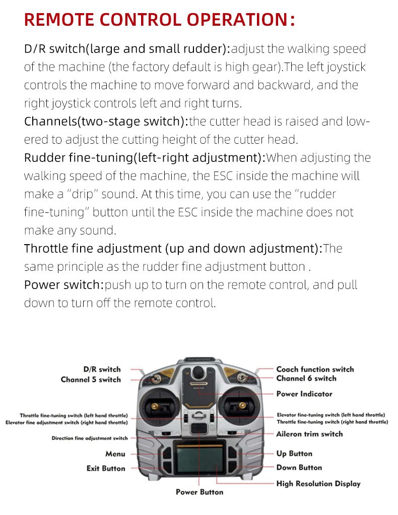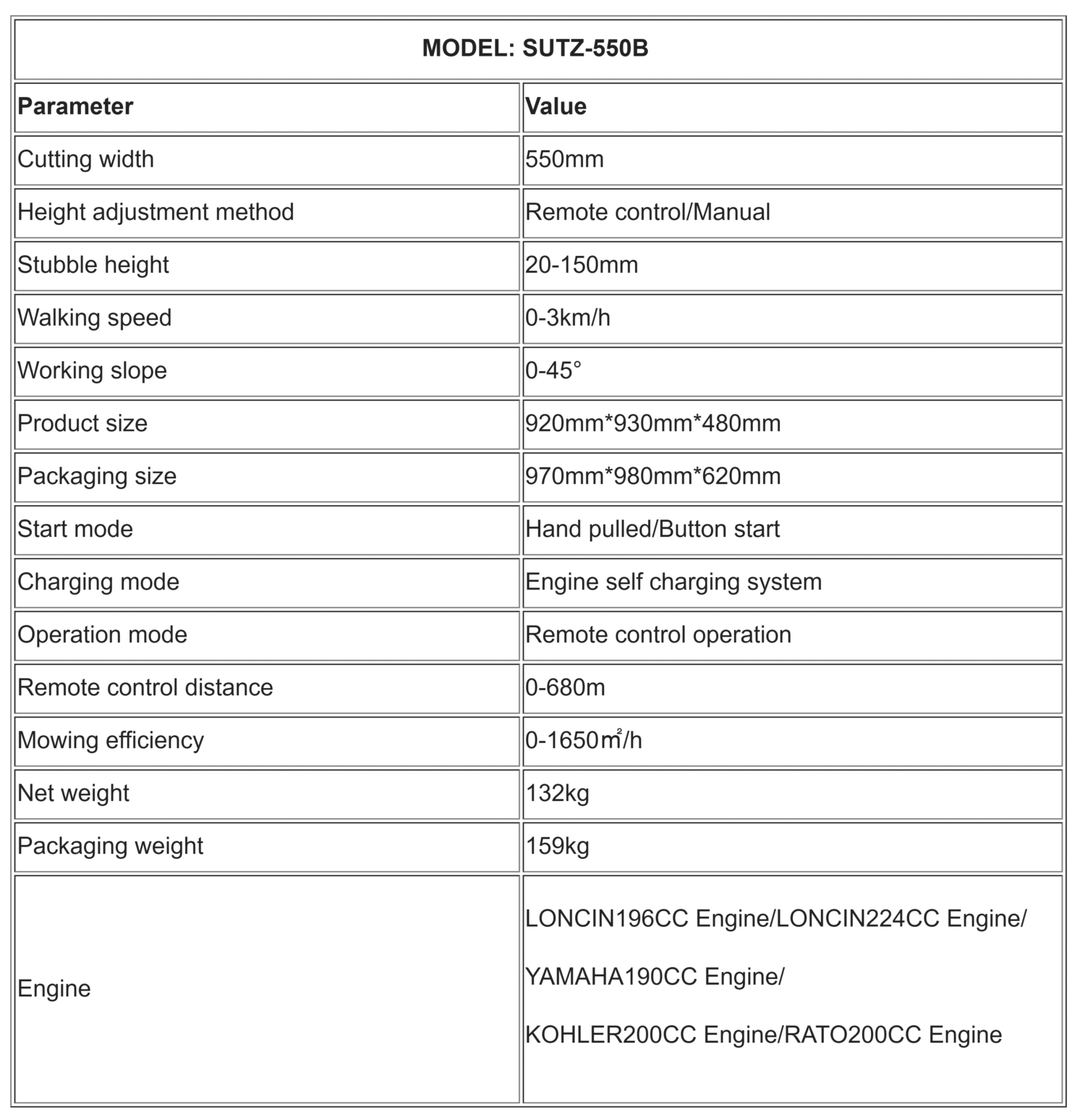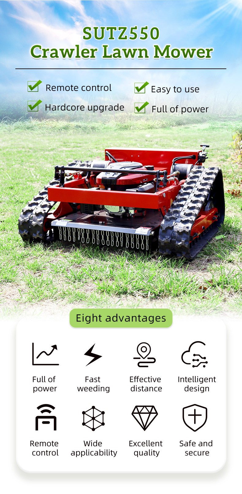The SUTZ-550B Crawler Remote Control Lawn Mower is a high-performance, remotely operated mower designed for steep slopes, large lawns, and commercial landscaping. With a 550mm cutting width and adjustable stubble height (20-150mm), it delivers precision cutting at speeds up to 3km/h, covering 1,650㎡/h. Powered by multiple engine options (Loncin, Yamaha, Kohler, RATO), it features self-charging and remote control operation (680m range), making it ideal for challenging terrain (up to 45° slopes)