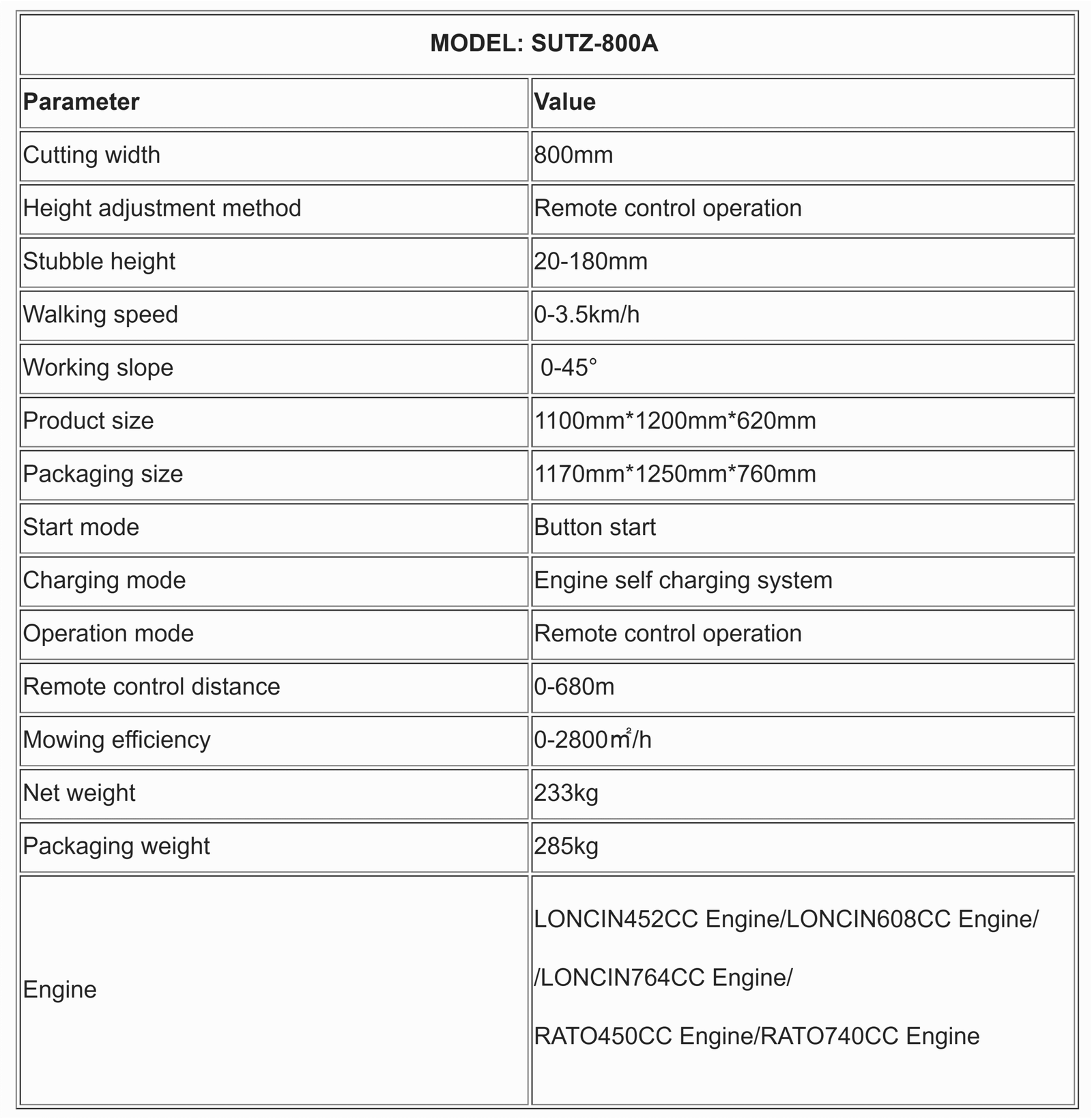 The SUTZ-800A is a heavy-duty remote-controlled crawler mower designed for commercial landscaping, steep slopes, and large-area mowing. With an 800mm cutting width and multiple high-torque engine options (Loncin 452cc/608cc/764cc, RATO 450cc/740cc), it delivers 2,800㎡/h mowing efficiency while tackling slopes up to 45°. Its 680m remote control range and 3.5km/h adjustable speed ensure safe, high-productivity operation in challenging environments.