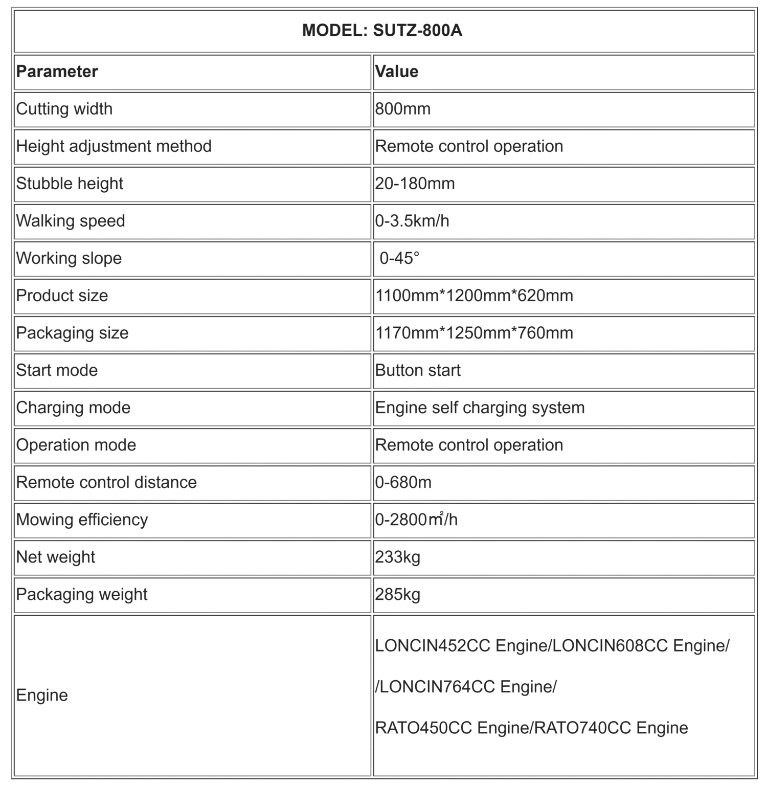 The SUTZ-800A is a heavy-duty remote-controlled crawler mower designed for commercial landscaping, steep slopes, and large-area mowing. With an 800mm cutting width and multiple high-torque engine options (Loncin 452cc/608cc/764cc, RATO 450cc/740cc), it delivers 2,800㎡/h mowing efficiency while tackling slopes up to 45°. Its 680m remote control range and 3.5km/h adjustable speed ensure safe, high-productivity operation in challenging environments.