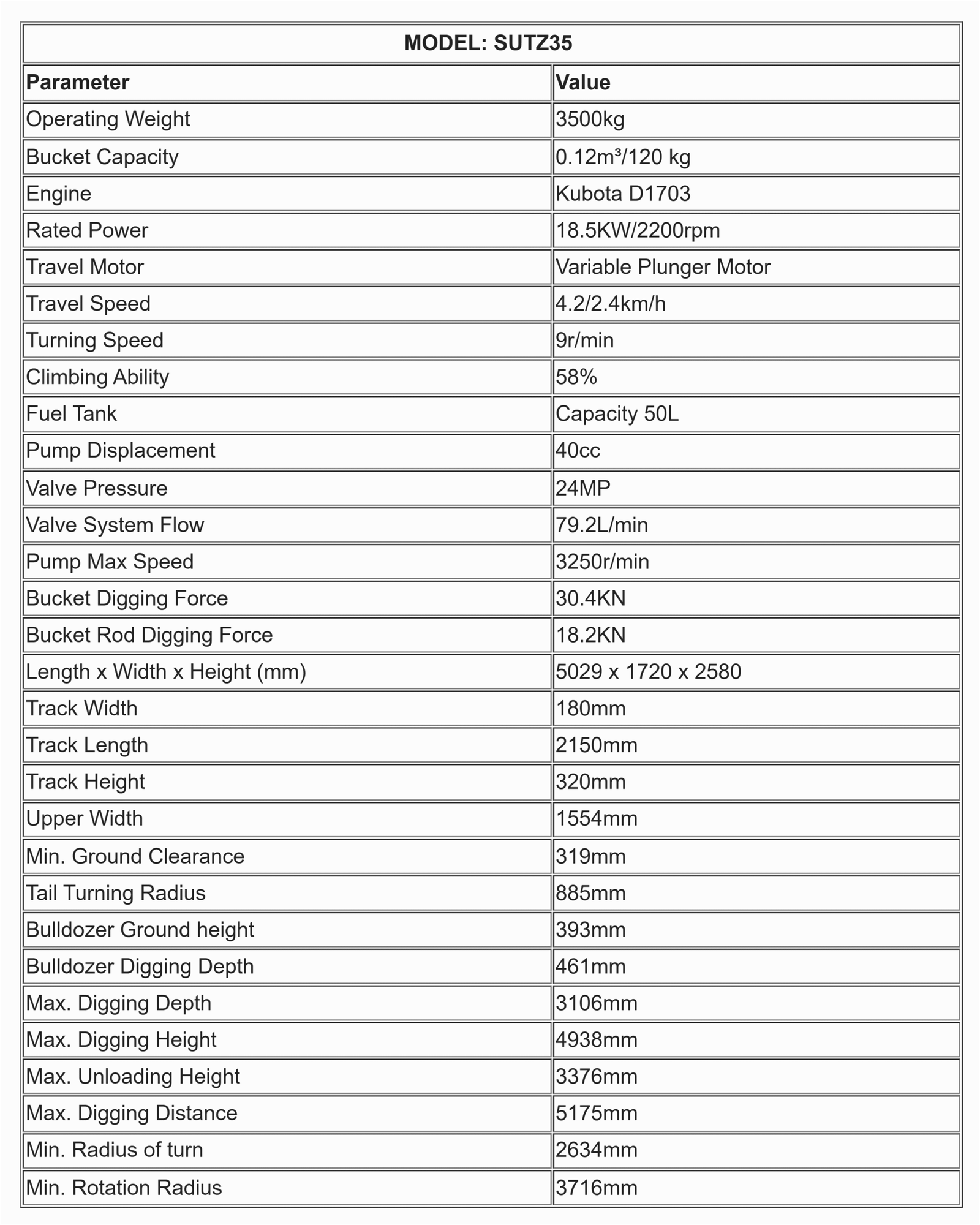 The SUTZ35 Mini Excavator is a premium compact machine that combines Kubota reliability with professional-grade digging performance. Its long reach, deep excavation, and high travel speed make it ideal for contractors needing a versatile, durable, and efficient mini excavator.
