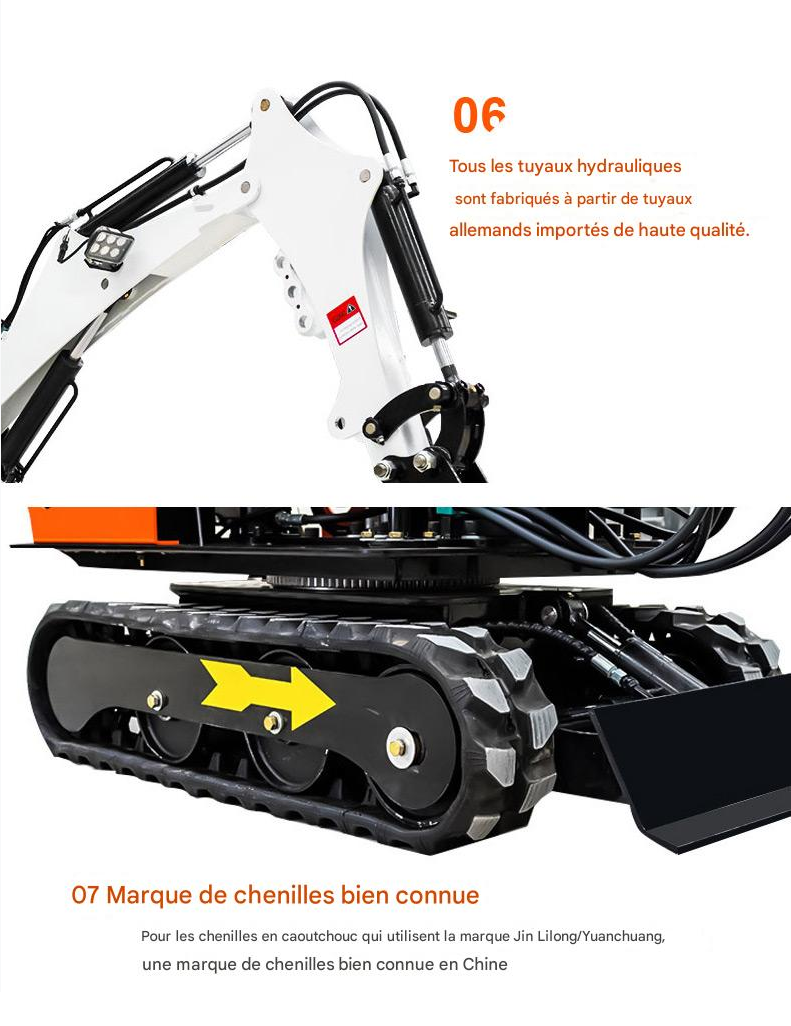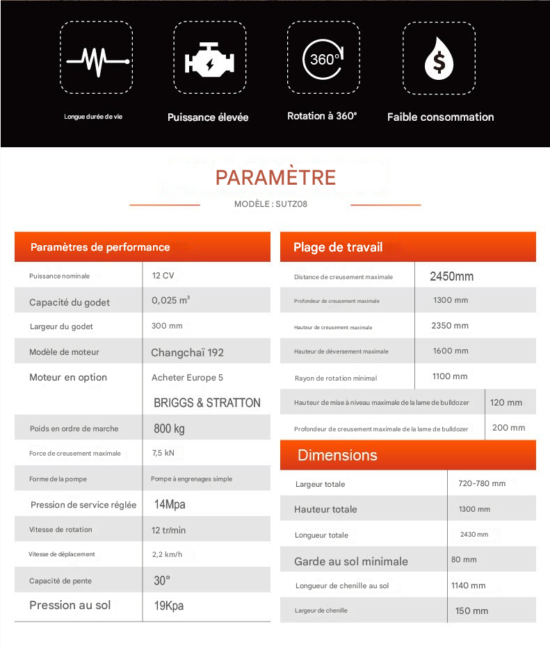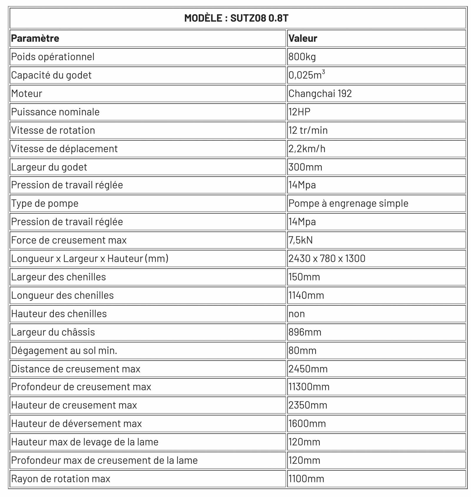 La mini-pelle SUTZ08 est une machine compacte et puissante, conçue pour allier efficacité et durabilité. Avec une puissance nominale de 12 CV et un poids en ordre de marche de 800 kg, elle offre une force de creusement importante (7,5 kN) et une polyvalence exceptionnelle, notamment une rotation à 360°. Son moteur longue durée (Changchai 192 ou Koop Europe 5 en option), sa faible consommation et ses accessoires multifonctions (godet, pince, tarière, marteau piqueur, etc.) en font la solution idéale pour les petits et moyens projets de construction et d’aménagement paysager. Sa conception robuste, notamment l’intégration avancée des vérins, sa peinture brillante et ses chenilles en caoutchouc haut de gamme (marque Jin Lilong/Yuanchuang), garantissent résistance à l’usure et longévité.