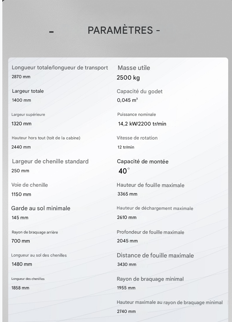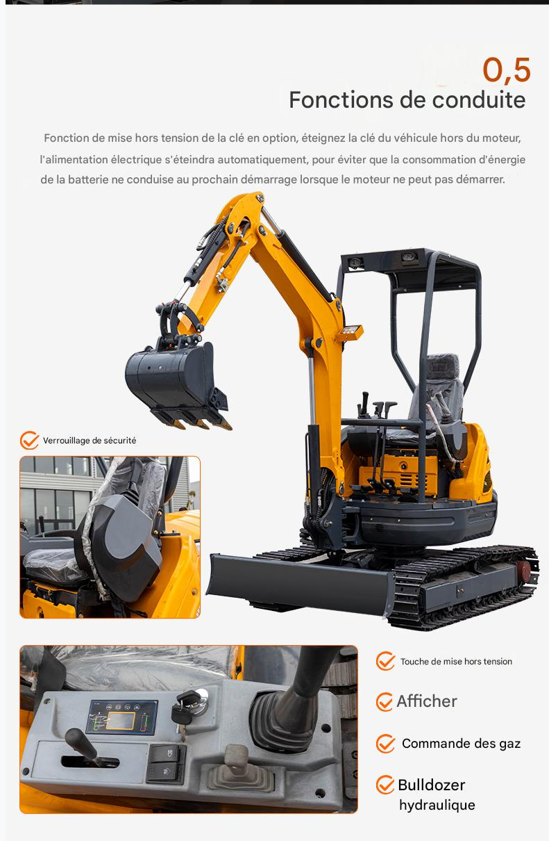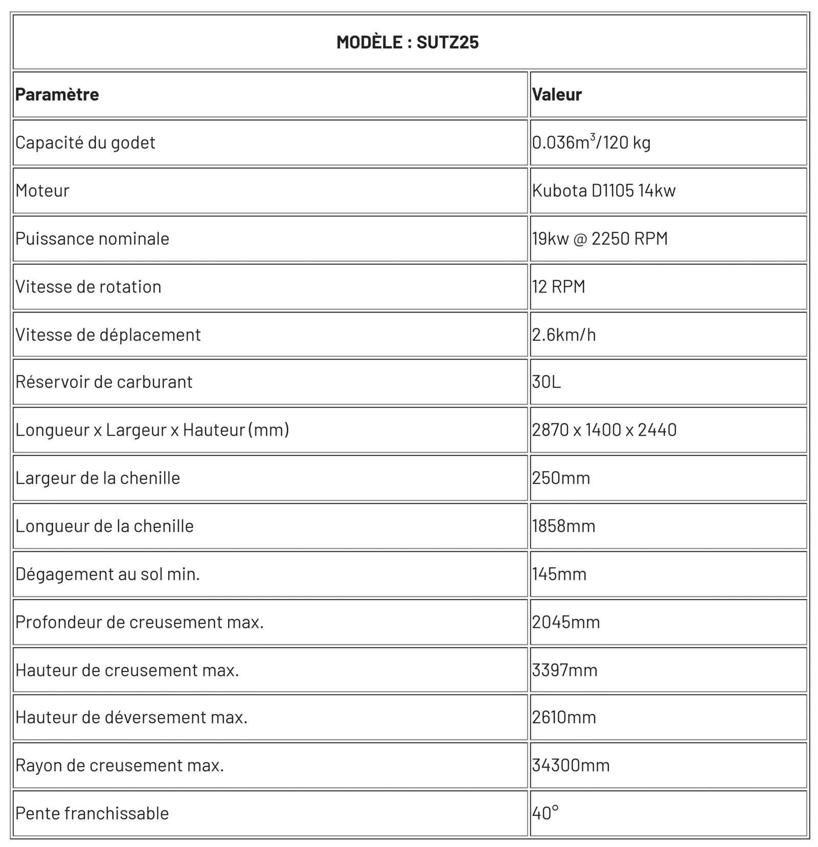 La pelle sur chenilles SUTZ25 est une machine compacte mais puissante, conçue pour l’efficacité et la polyvalence dans les espaces de travail restreints. Propulsée par un moteur Kubota D1105 (14 kW), elle offre des performances fiables avec une capacité de godet de 0,036 m³ et une profondeur de creusement maximale de 2 045 mm. Sa vitesse de déplacement de 2,6 km/h et son angle de rotation de 360° assurent une excellente maniabilité, ce qui la rend idéale pour la construction urbaine, l’aménagement paysager et les projets utilitaires.