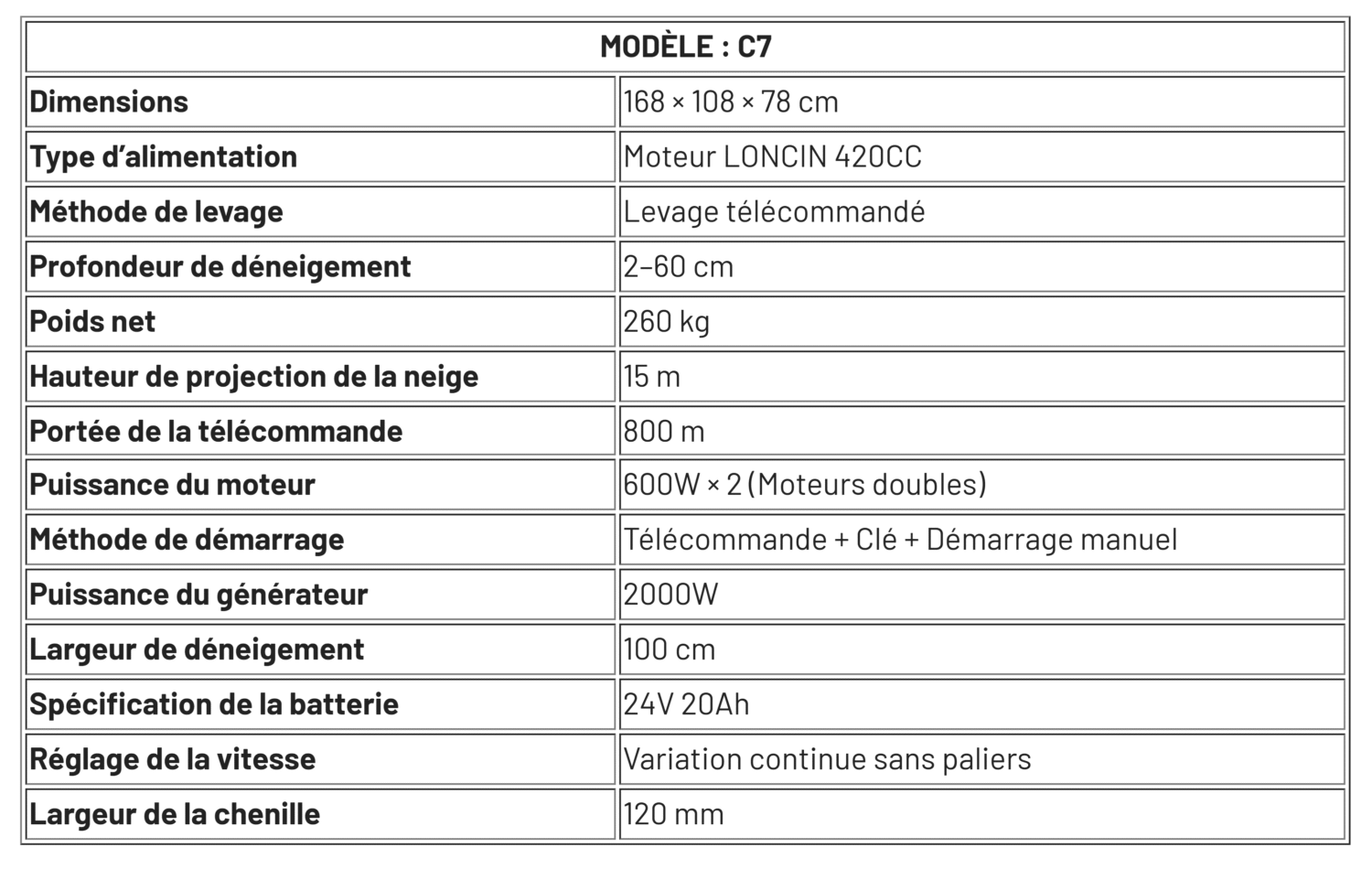 Déneigez avec la SUTZ-C7, une souffleuse à neige à chenilles de qualité professionnelle conçue pour le déneigement à grande échelle. Équipée d’un moteur LONCIN de 420 cm³ et de deux moteurs de 600 W, elle dégage sans effort des chemins de 100 cm de large et projette la neige jusqu’à 15 mètres. Dotée d’une télécommande (portée de 800 m), d’un réglage de vitesse en continu et de chenilles en caoutchouc (120 mm de large) pour une traction supérieure, elle gère facilement des épaisseurs de neige de 2 à 60 cm. Idéale pour les allées, les sites commerciaux et les utilisations municipales, cette machine de 260 kg allie performances robustes et commodité avancée.