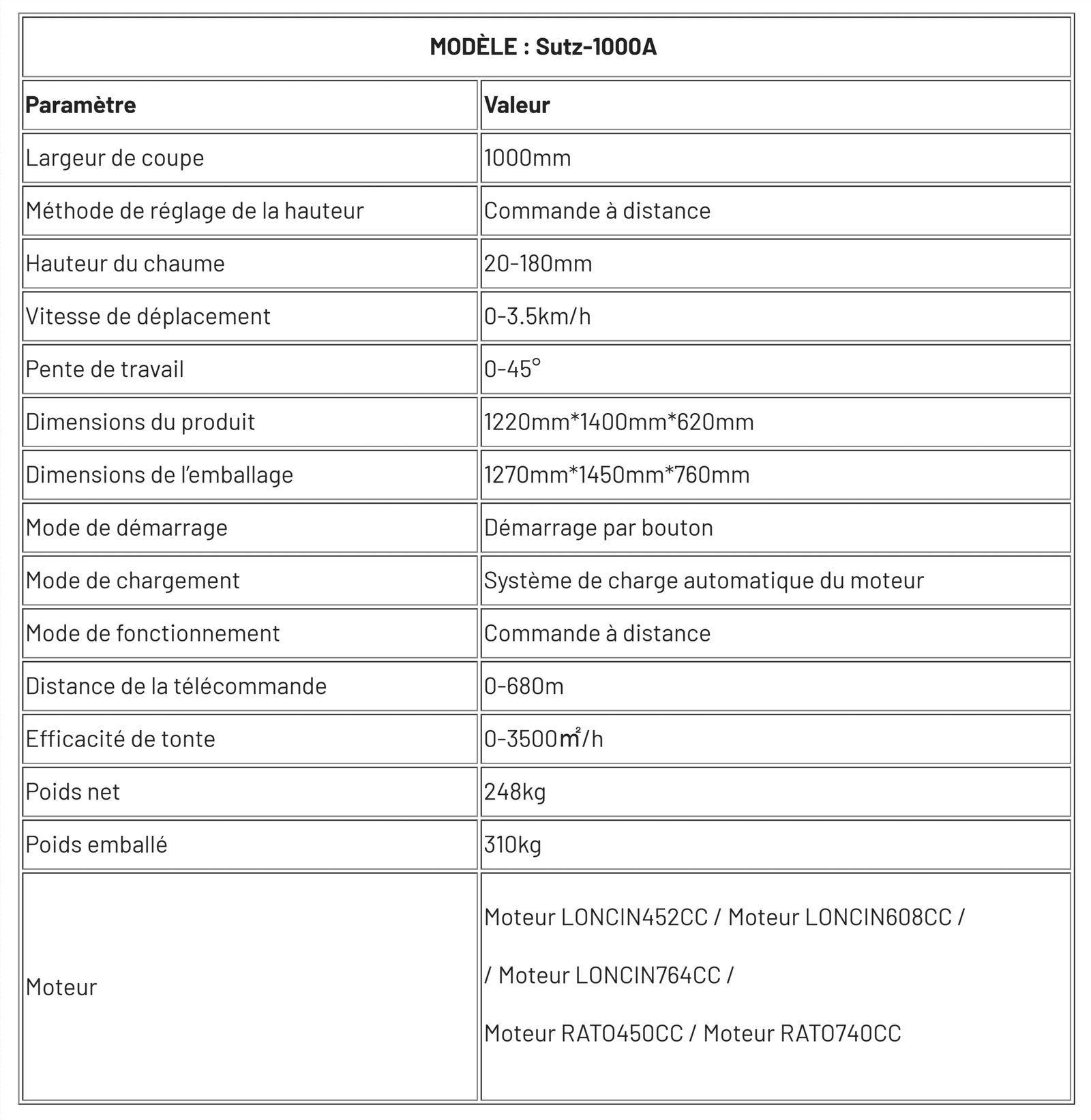 La SUTZ-1000A est une tondeuse sur chenilles télécommandée robuste conçue pour les applications d’aménagement paysager commerciales. Dotée d’une largeur de coupe impressionnante de 1000 mm et de plusieurs motorisations puissantes (LONCIN 452CC-764CC/RATO 450CC-740CC), cette machine offre des performances de tonte de niveau professionnel avec une efficacité de 0 à 3500 ㎡/h. Son châssis robuste de 248 kg et sa capacité à s’incliner à 45° la rendent idéale pour les terrains difficiles, tandis que sa portée de 680 m garantit la sécurité de l’opérateur en conditions dangereuses. Le système de recharge automatique et le grand réservoir de carburant de 15 L permettent une utilisation prolongée sans arrêts fréquents.