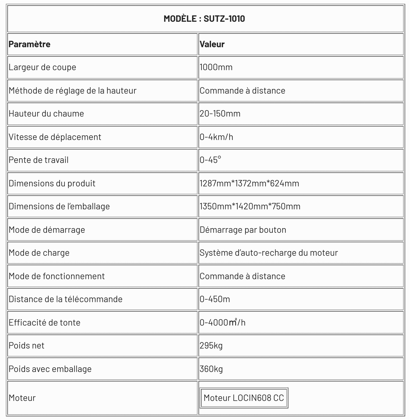 La SUTZ-1010 est une tondeuse à chenilles télécommandée robuste conçue pour l’aménagement paysager commercial à grande échelle. Dotée d’un moteur Loncin industriel de 608 cm3 et d’une largeur de coupe de 1 m, elle offre une efficacité de tonte de 4 000 ㎡/h sur des pentes jusqu’à 45°. Avec une portée de commande sans fil de 450 m et une vitesse de déplacement de 4 km/h, elle allie puissance, précision et sécurité pour les terrains difficiles.