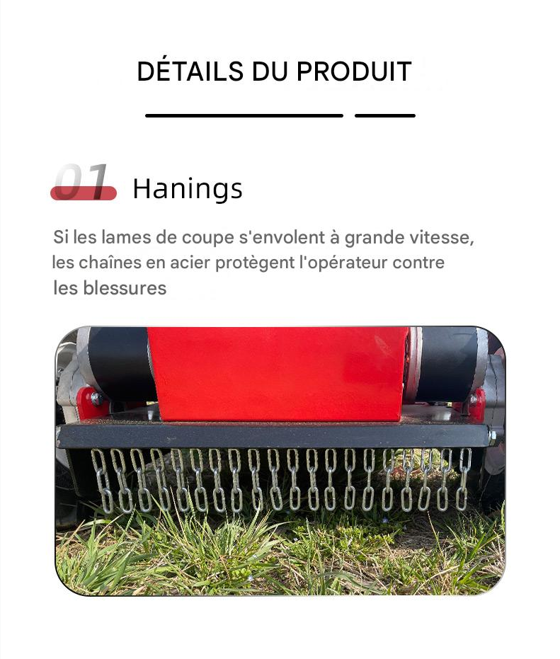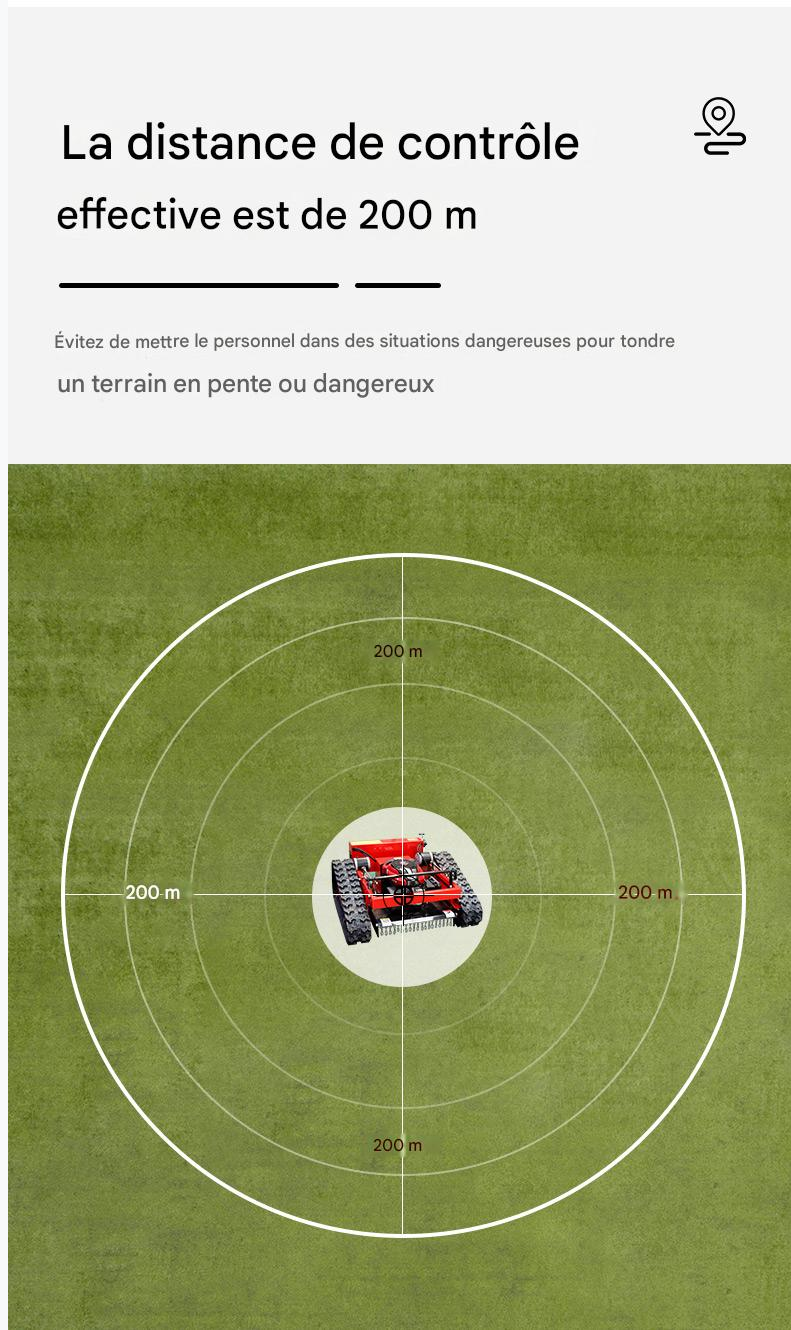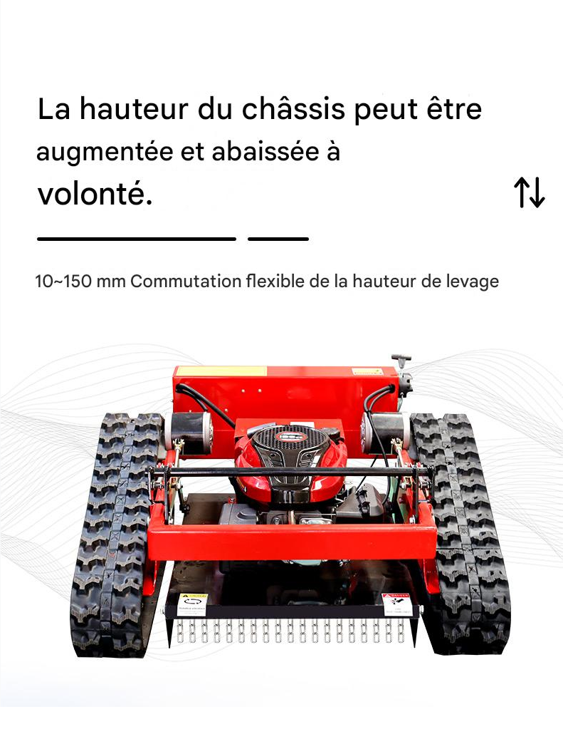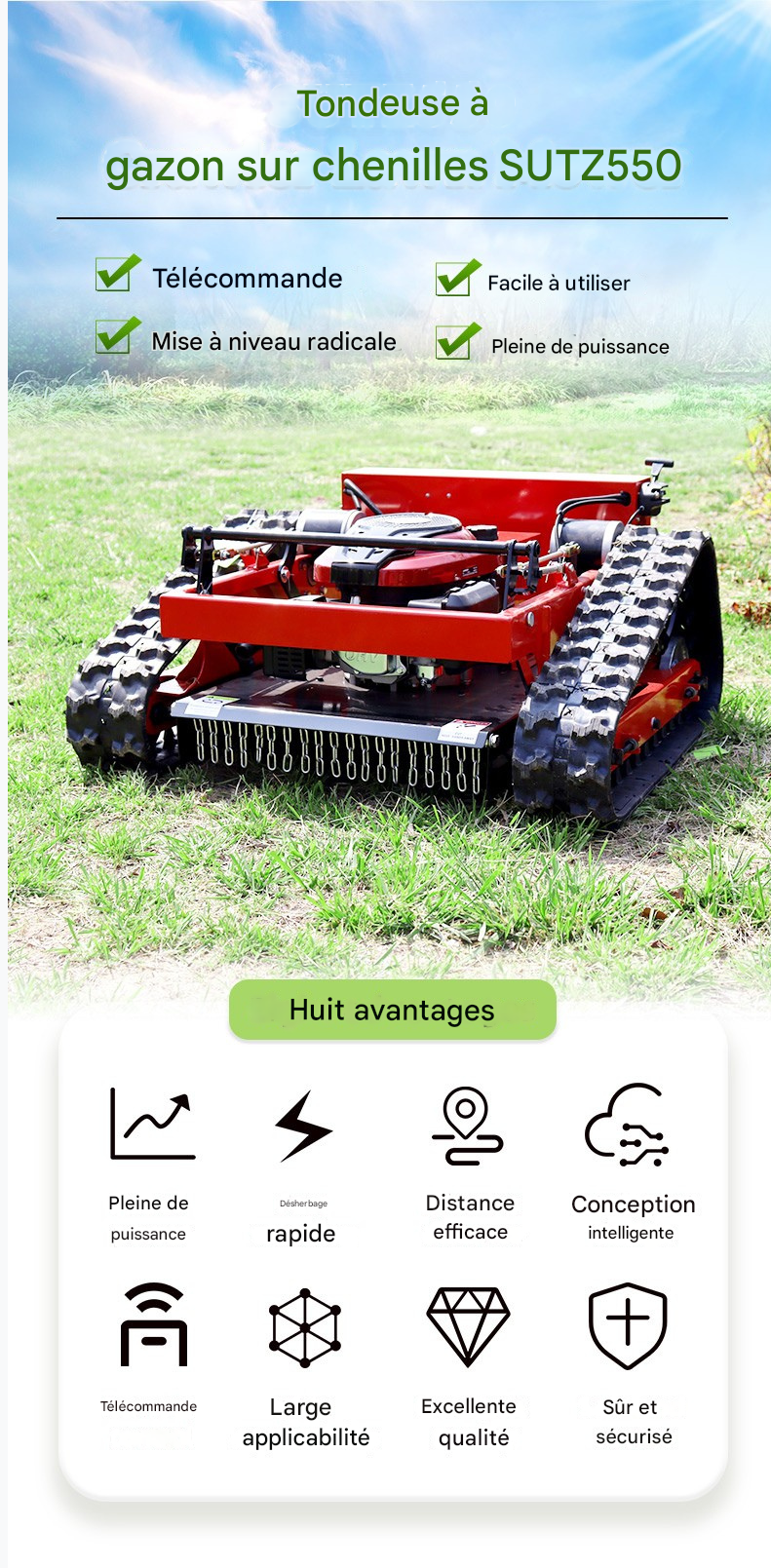 La tondeuse à gazon télécommandée sur chenilles SUTZ-550B est une tondeuse haute performance, télécommandée, conçue pour les pentes raides, les grandes pelouses et les aménagements paysagers commerciaux. Avec une largeur de coupe de 550 mm et une hauteur de coupe réglable (20-150 mm), elle offre une coupe de précision à des vitesses allant jusqu’à 3 km/h, couvrant 1 650 m²/h. Propulsée par plusieurs moteurs (Loncin, Yamaha, Kohler, RATO), elle est dotée d’un système de recharge automatique et d’une télécommande (portée de 680 m), ce qui la rend idéale pour les terrains difficiles (pentes jusqu’à 45°).