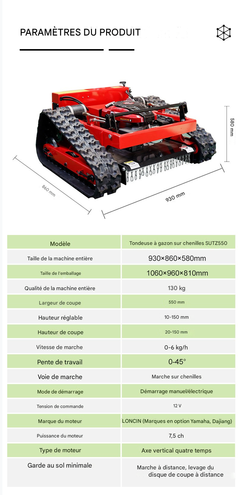 Tondeuse à gazon télécommandée sur chenilles SUTZ-550B