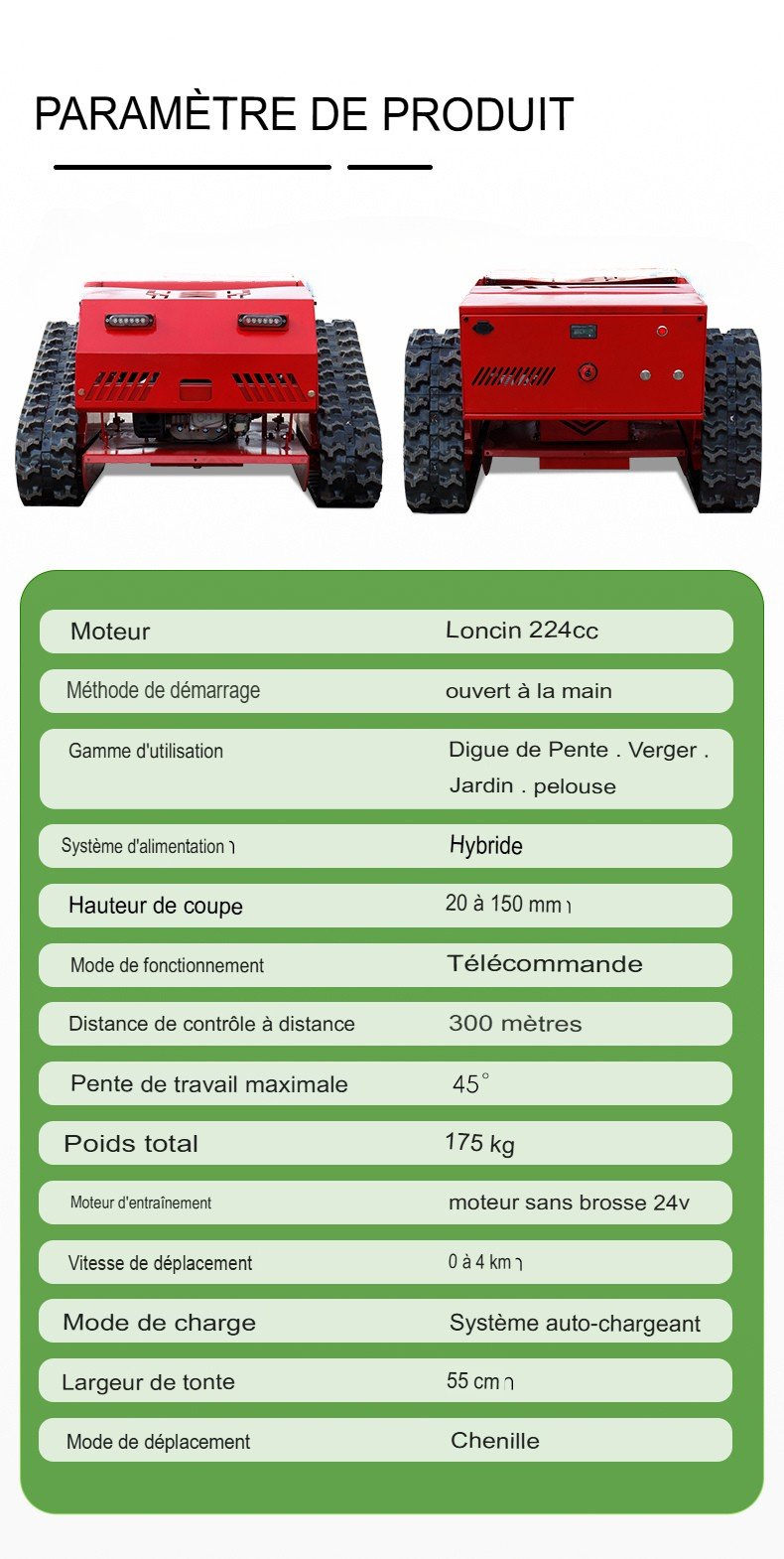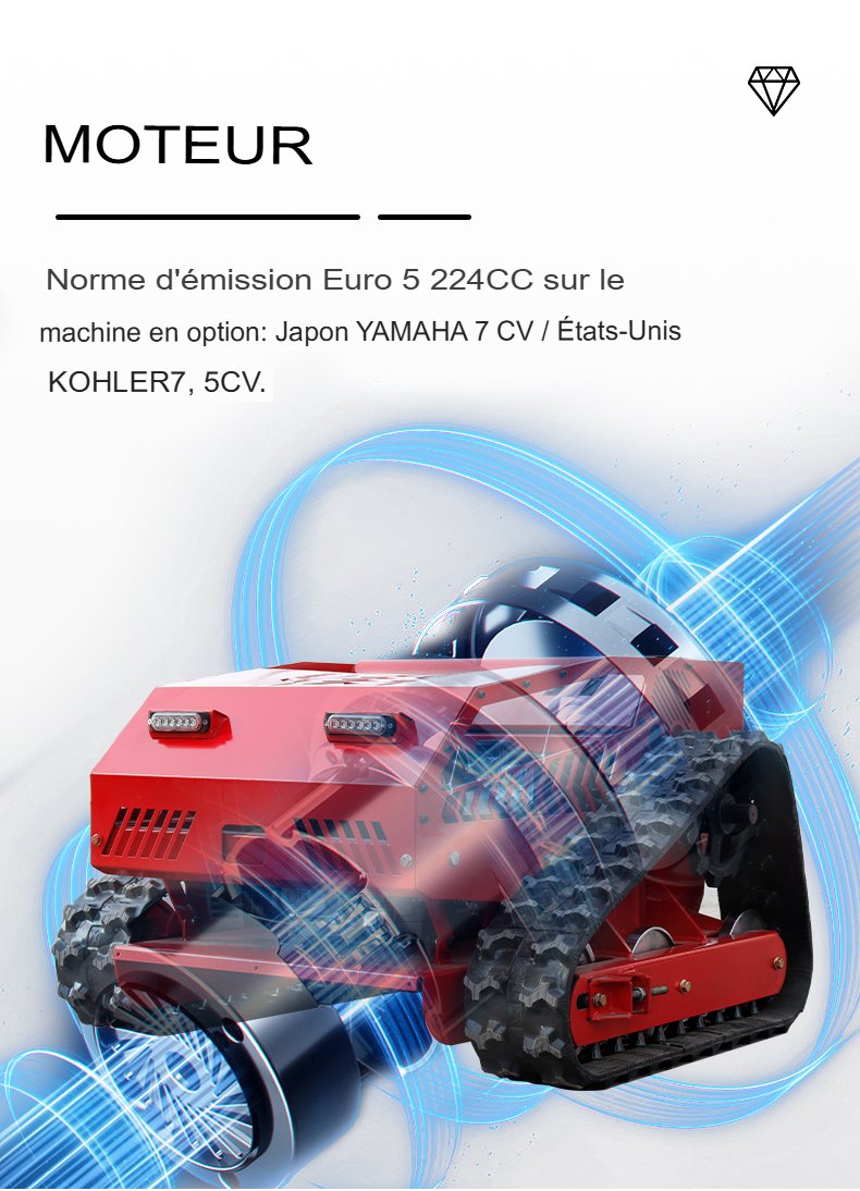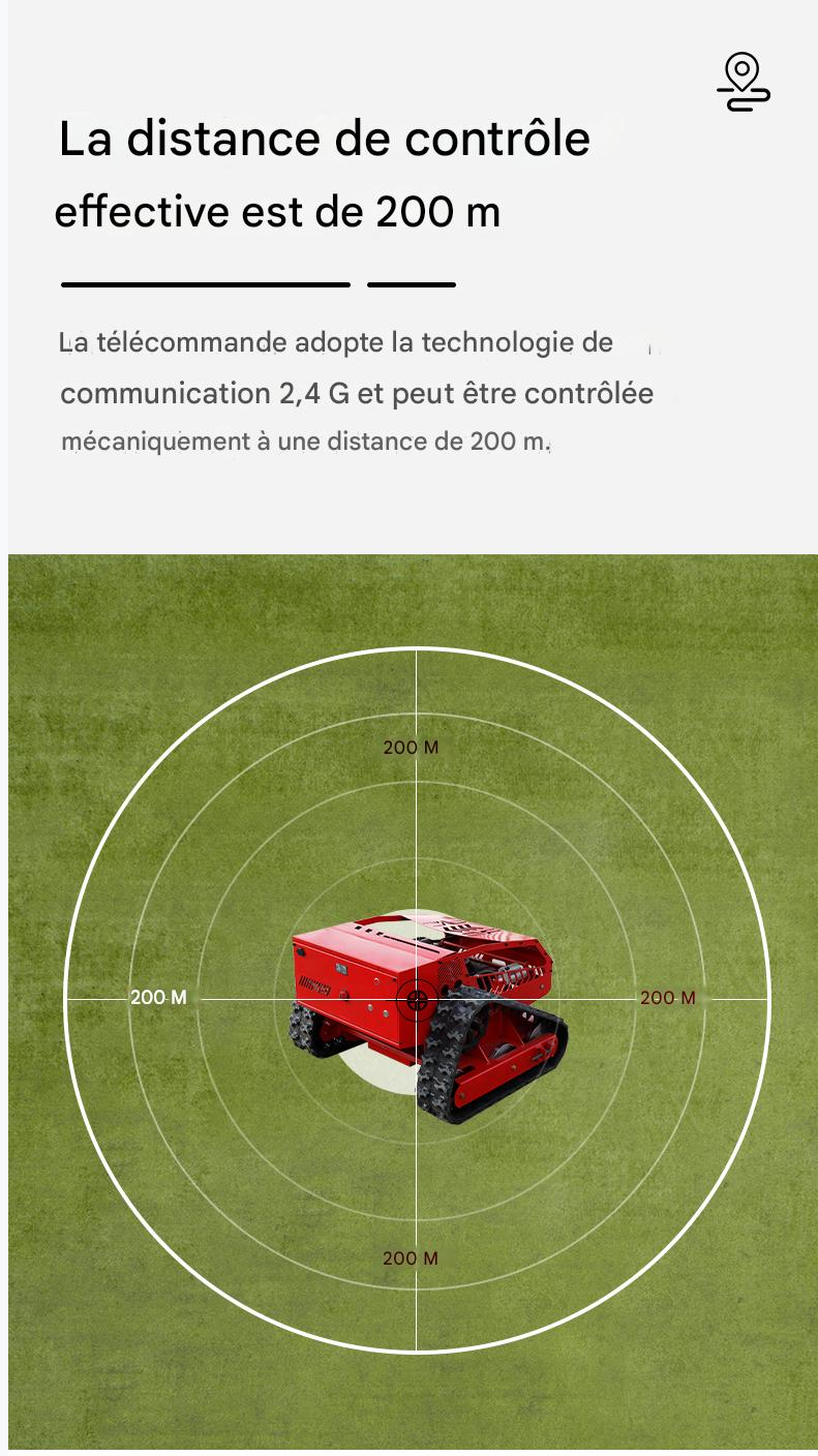 Attaquez-vous aux pentes, vergers, jardins et pelouses avec précision grâce à la Sutz750. Équipée d’un moteur Loncin de 224 cm³ et d’un moteur brushless de 24 V, cette tondeuse hybride offre une tonte efficace et télécommandée jusqu’à 45° de pente. Avec une portée de 300 m, une largeur de coupe de 55 cm et un mouvement de type chenille, elle offre une adaptabilité inégalée au terrain. Robuste, auto-rechargeable et compacte, elle est conçue pour une gestion performante de l’herbe.