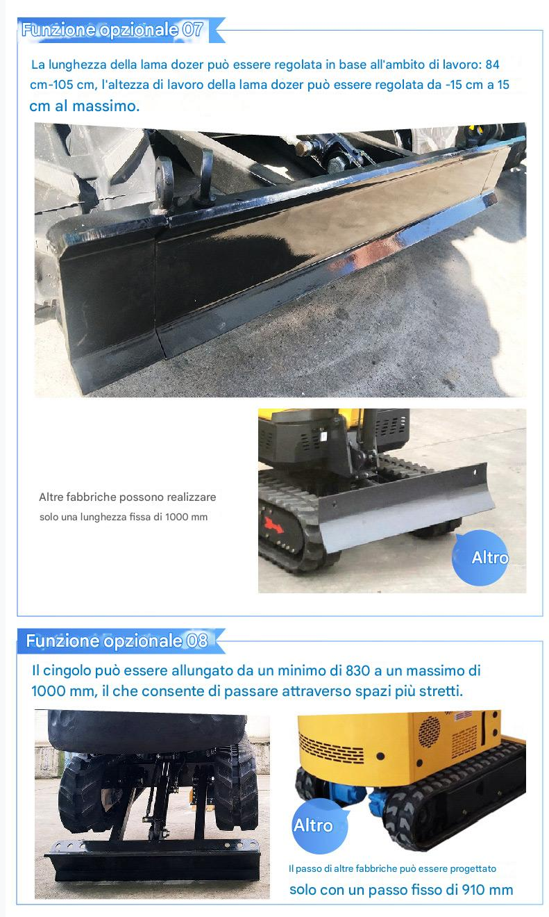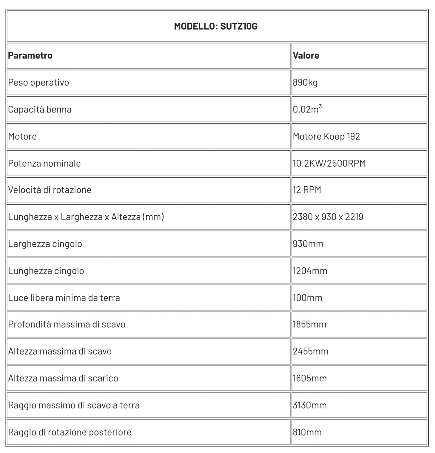 Il miniescavatore SUTZ10G è una soluzione ultracompatta per il movimento terra, con un peso di soli 890 kg, progettata per la massima manovrabilità in spazi ristretti. Alimentato da un motore Koop 192 (10,2 kW) a basso consumo di carburante, questa agile macchina offre prestazioni sorprendenti con una profondità di scavo di 1855 mm e una capacità di salita di 30°. La sua larghezza ridotta di 940 mm e il raggio di rotazione posteriore minimo di 810 mm consentono l’utilizzo in aree urbane ristrette, giardini e cantieri interni, dove attrezzature più grandi non possono arrivare.