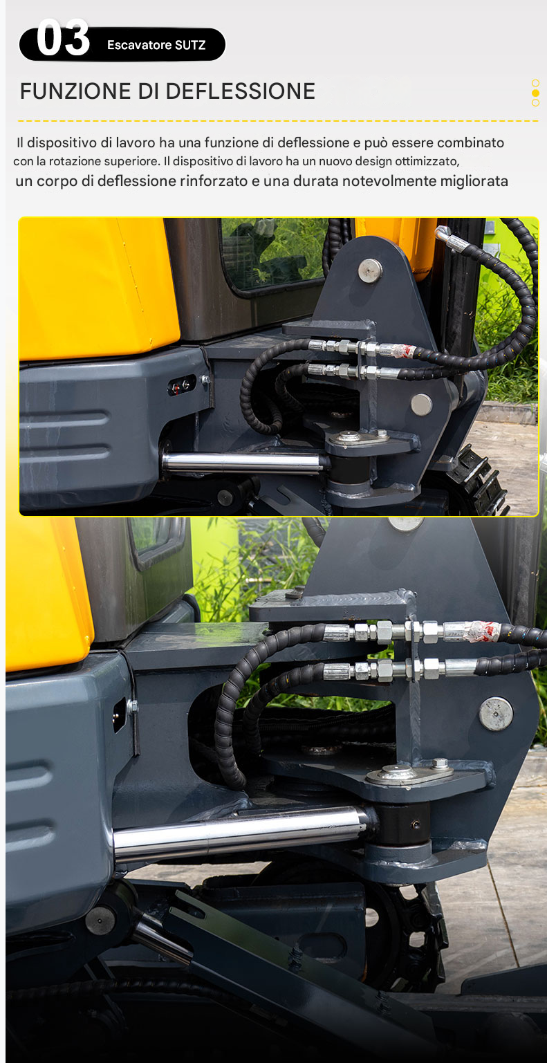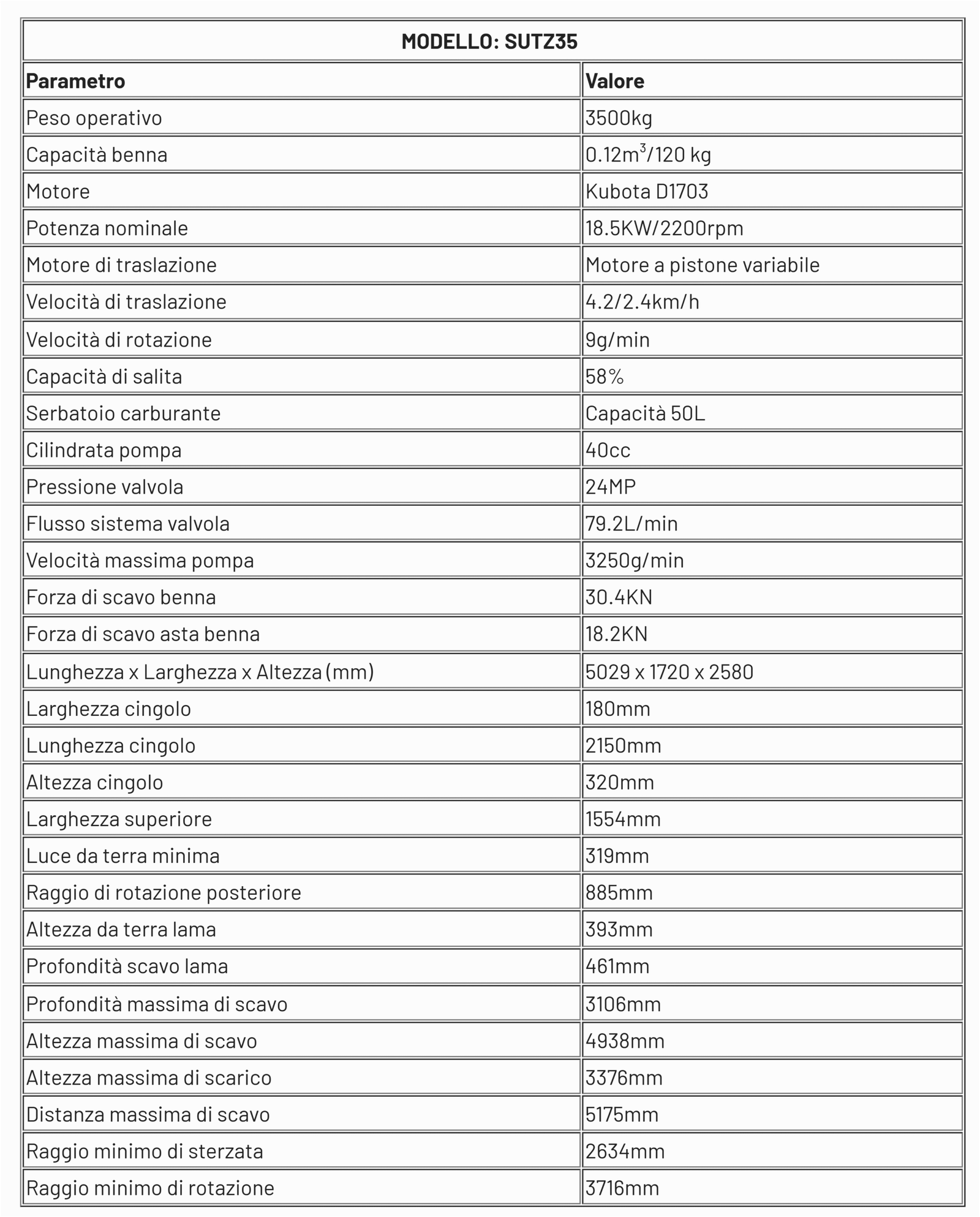 Il miniescavatore SUTZ35 è una macchina compatta di alta qualità che unisce l’affidabilità Kubota a prestazioni di scavo di livello professionale. Il suo ampio sbraccio, la profondità di scavo e l’elevata velocità di traslazione lo rendono ideale per gli appaltatori che necessitano di un miniescavatore versatile, durevole ed efficiente.
