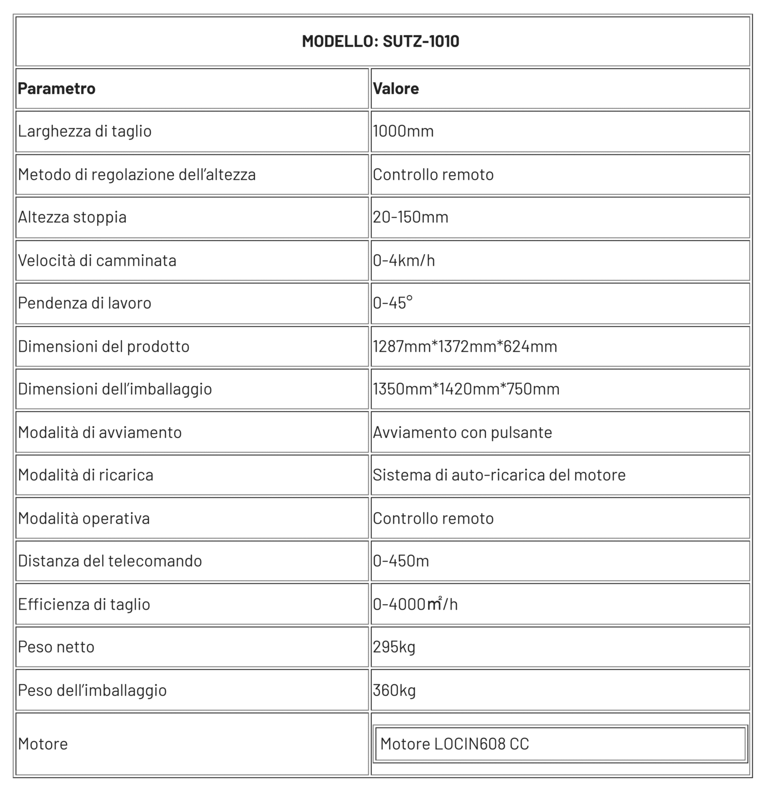 Il modello SUTZ-1010 è un tosaerba cingolato telecomandato per impieghi gravosi, progettato per lavori di giardinaggio commerciale su larga scala. Dotato di un motore Loncin industriale da 608 cc e di una larghezza di taglio di 1 m, offre un’efficienza di taglio di 4.000㎡/h su pendenze fino a 45°. Con un raggio di controllo wireless di 450 m e una velocità di avanzamento di 4 km/h, combina potenza, precisione e sicurezza per terreni impegnativi.