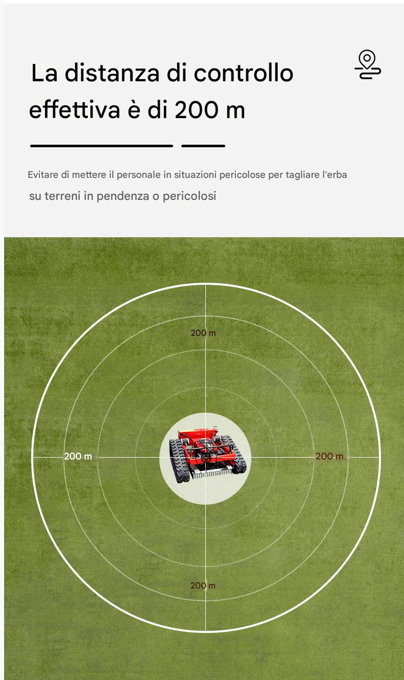 Il rasaerba cingolato telecomandato SUTZ-550B è un rasaerba ad alte prestazioni, telecomandato, progettato per pendii ripidi, prati di grandi dimensioni e giardinaggio commerciale. Con una larghezza di taglio di 550 mm e un’altezza di taglio regolabile (20-150 mm), offre un taglio di precisione a velocità fino a 3 km/h, coprendo 1.650 m²/h. Alimentato da diverse opzioni di motore (Loncin, Yamaha, Kohler, RATO), è dotato di ricarica automatica e funzionamento tramite telecomando (portata di 680 m), che lo rendono ideale per terreni impegnativi (pendenze fino a 45°).