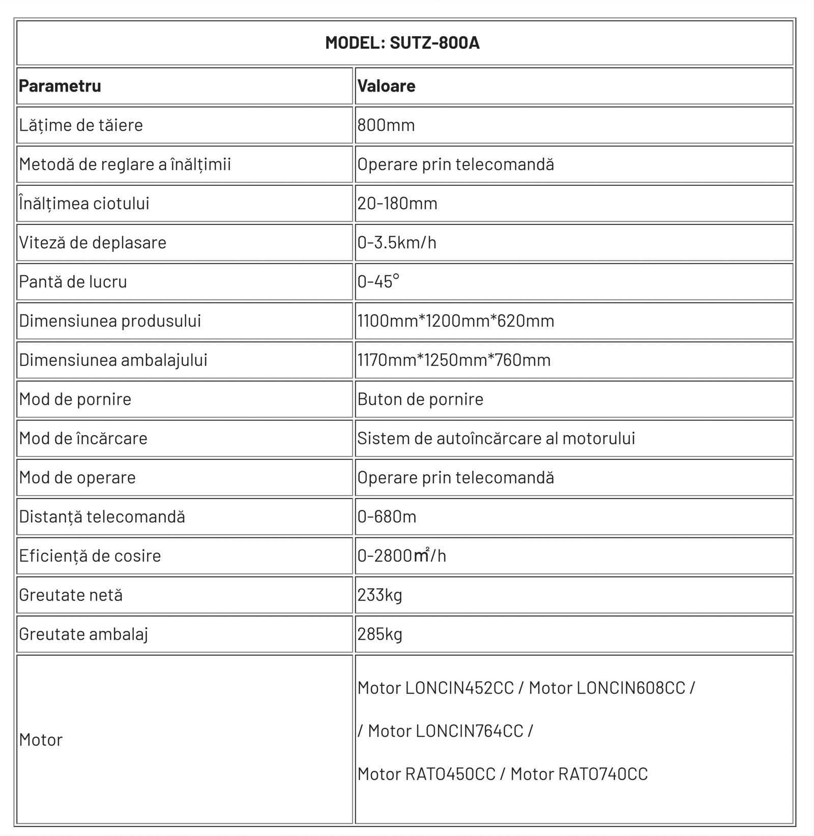 SUTZ-800A este o mașină de tuns iarba pe șenile cu telecomandă, de mare putere, concepută pentru amenajarea peisagistică comercială, pante abrupte și cosirea suprafețelor mari. Cu o lățime de tăiere de 800 mm și multiple opțiuni de motor cu cuplu ridicat (Loncin 452cc/608cc/764cc, RATO 450cc/740cc), aceasta oferă o eficiență de cosire de 2.800 m/h, abordând pante de până la 45°. Raza de acțiune a telecomenzii de 680 m și viteza reglabilă de 3,5 km/h asigură o funcționare sigură și de înaltă productivitate în medii dificile.